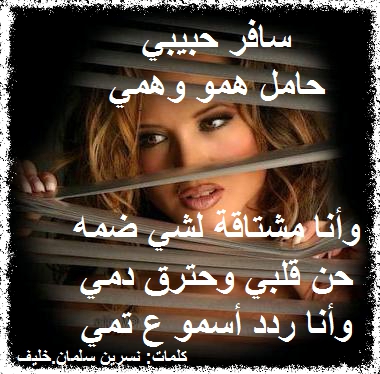 سافر حبيبي جعل ربي يخليه والقلب من فرقاه أعلن حداده سافر وروحي بالهوى مولعه فيه ارجى وصاله ثم اعشق وداده حيثه غلا روحي وبالقلب شاريه هو طب قلب ما لقيناه ضماده يستاهل